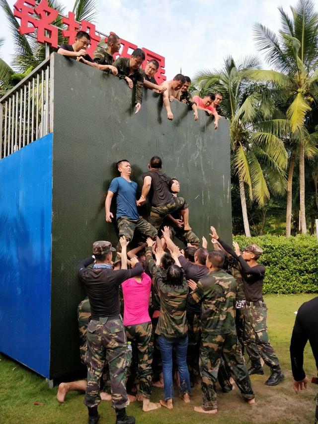 最后一个拓展项目,也是大家最为难忘的"毕业墙"。在不借助任何外力的情况下,要徒手攀登上高达四米二的光滑墙壁,甘当人梯的同学们为攀登的同学搭建了一个坚实的踏板,已经翻越高墙的同学们纷纷伸出双手紧紧拉住每一个正在攀登的同学,当最后一人成功跃上墙头的时候,全场鼓掌欢呼、兴奋不已,只有你我无私的奉献,才有最终的成功。