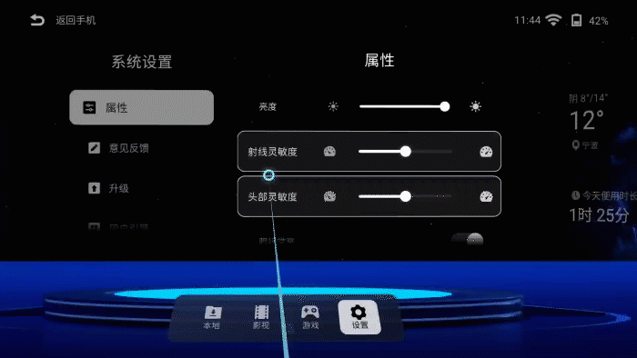 当我们使用Type-C线直连相应设备时,它发挥的作用与一般DP线几乎没有区别,直接将 雷鸟Air 智能眼镜作为镜像屏幕使用,在PC上则可以进行包括镜像、扩展、单独显示等多种模式设置。而在手机、平板上搭配“雷鸟XR眼镜”专属APP使用时,则可以为我们带来更多与“扩展现实”相关的功能。得益于内置的加速度传感器与陀螺仪,雷鸟Air 在专属APP界面中能够实现画面视角随头部转动,而手机等设备内的陀螺仪信息也能够传输至 雷鸟Air 智能眼镜中,用户只需握住手机、翻转手腕,就可以用射线光标对APP内界面进行3D操控。