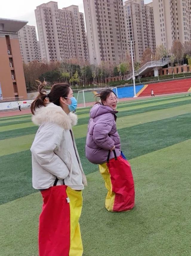 每队人数相等,每人拿一个大布袋,像穿裤子一样套进去,手把布袋尽量往上拉。每组的第一个队员先快速的跳向终点,再跳回来,让下一位队员继续跳向终点,再跳回来,如此让每队的每一个队员都必须跳完,用时少者为胜。